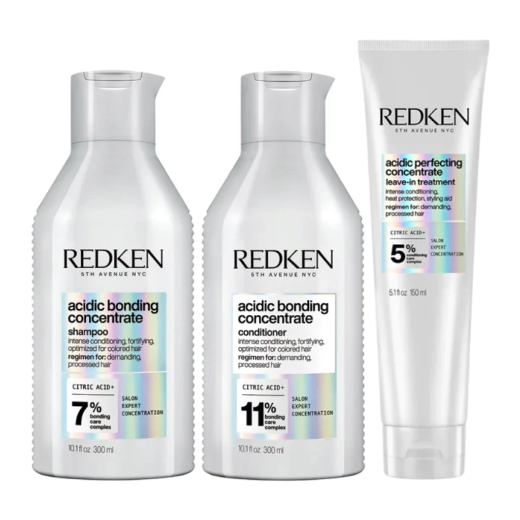 O Kit Redken Acidic Bonding Concentrate apresenta um tratamento em 3 etapas de um sistema de reparação de danos. Sua fórmula contém ácido cítrico e Redken Bonding Complex, ativos que promovem resultados instantaneamente visíveis. Confere força, hidratação e restauração, além de melhorar a resistência e equilibrar o pH para um cabelo mais saudável. Em fios descoloridos, age prevenindo o desbotamento da cor.