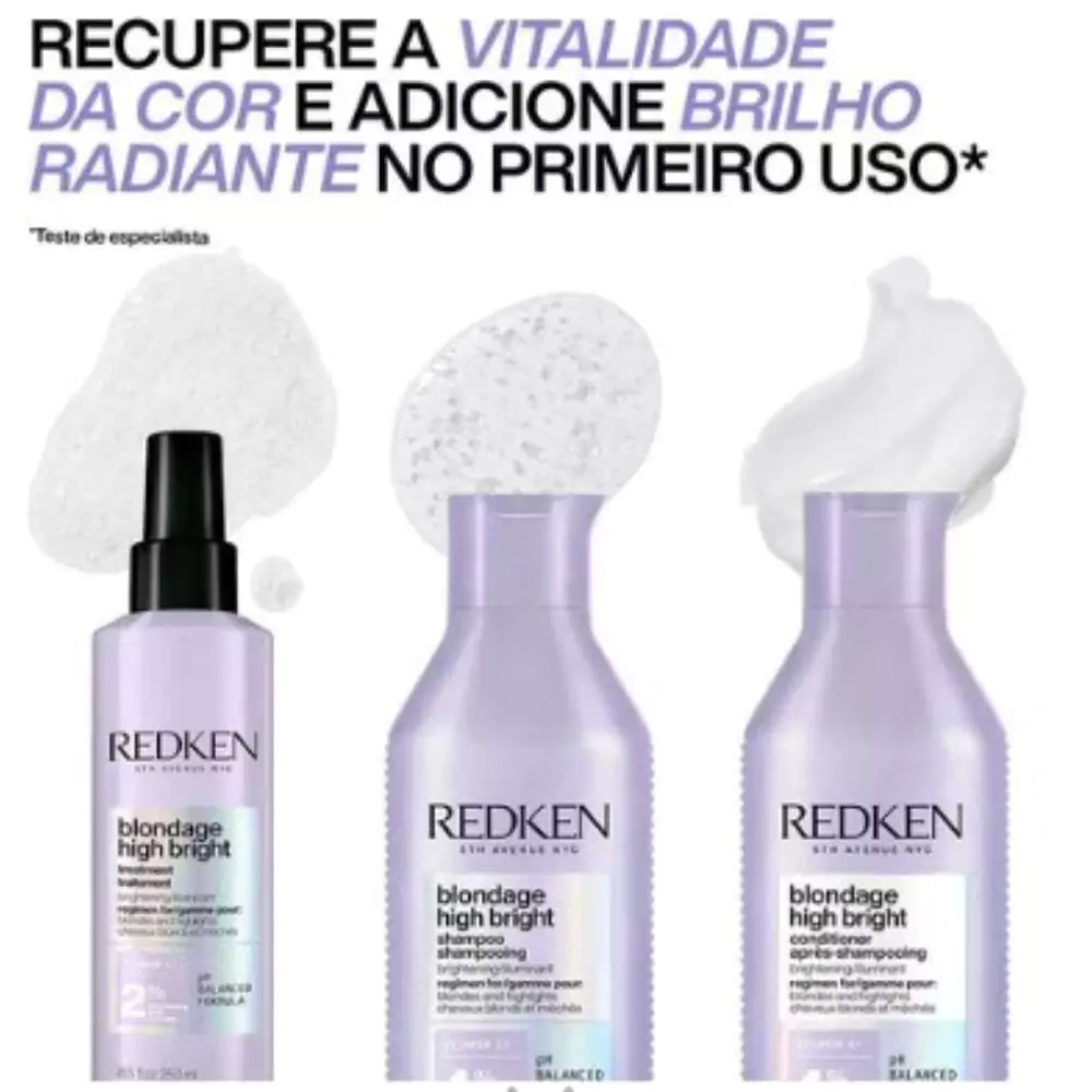 Pré-Shampoo para cabelos loiros. Redken Blondage High Bright prepara os fios, fortalecendo a ação antioxidante e revitalizadora dos ativos.